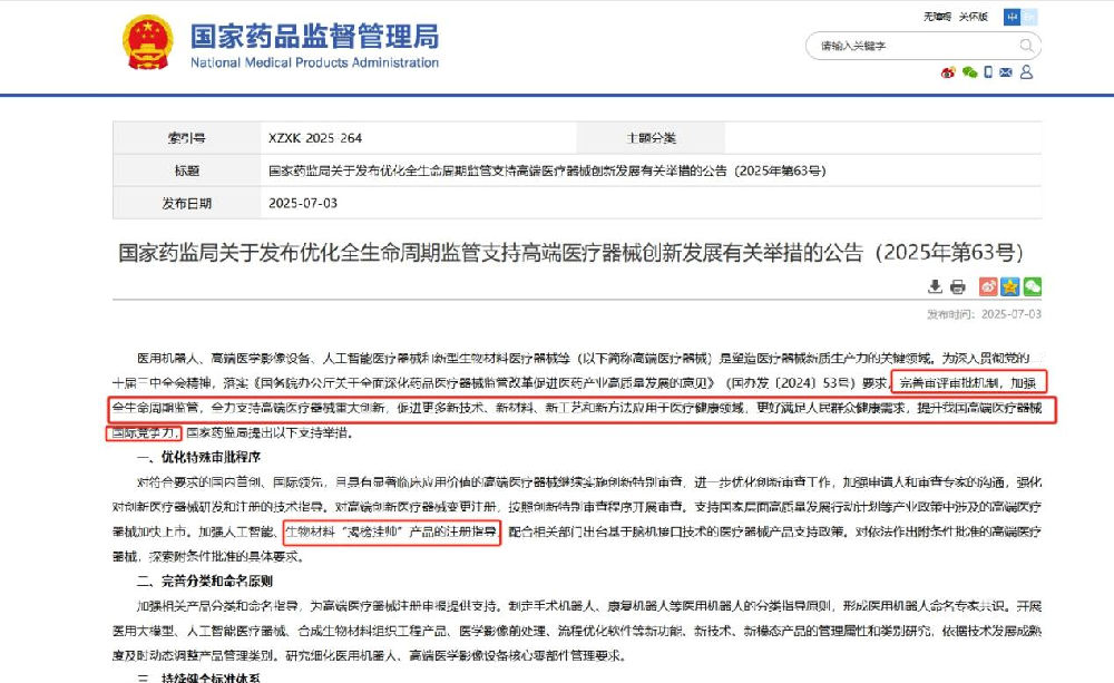 随着现代医疗水平的不断发展,医疗器械已广泛用于疾病的诊断、预判、监护、治疗或缓解等。今年7月,国家药监局发布《国家药监局关于发布优化全生命周期监管支持高端医疗器械创新发展有关举措的公告(2025年第63号)》,这一利好政策的出台无疑为高端医疗器械行业发展注入了强劲动力。