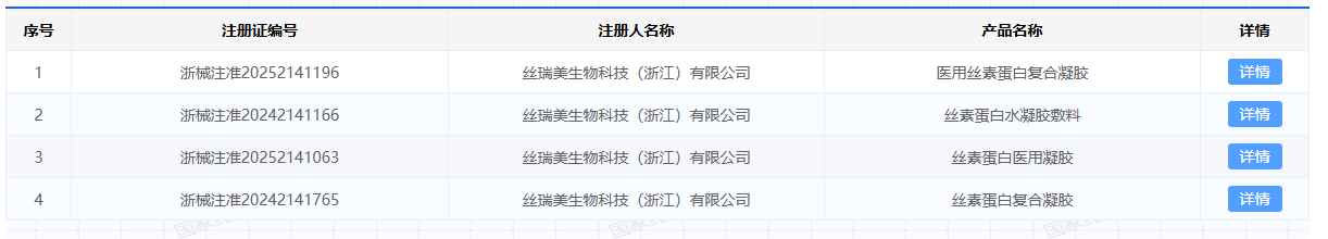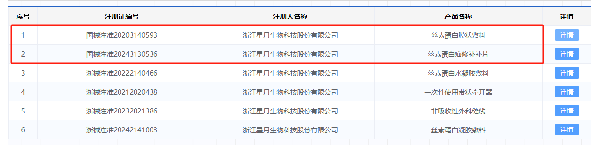 目前,星月生物历经近20年的技术沉淀,已将丝素蛋白成功应用到医疗器械、医疗美容、功效护肤等领域。在医疗器械领域,星月生物及其子公司丝瑞美生物已累计获得10项医疗器械注册证,其中,2项是三类医疗器械注册证。