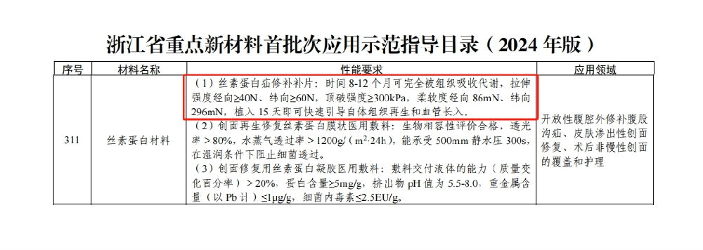 多中心临床验证的蚕丝材料疝修补产品——丝素蛋白疝修补补片,于2024年获三类医疗器械注册证,并被纳入《浙江省重点新材料首批次应用示范指导目录(2024年版)》。该产品由桑蚕丝经经编、脱胶处理等工艺制成的网状补片,其成分为丝素蛋白,适用于开放性腹腔外修补腹股沟疝。