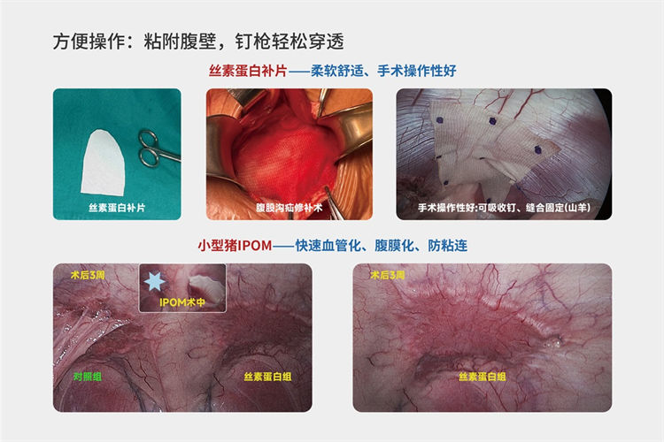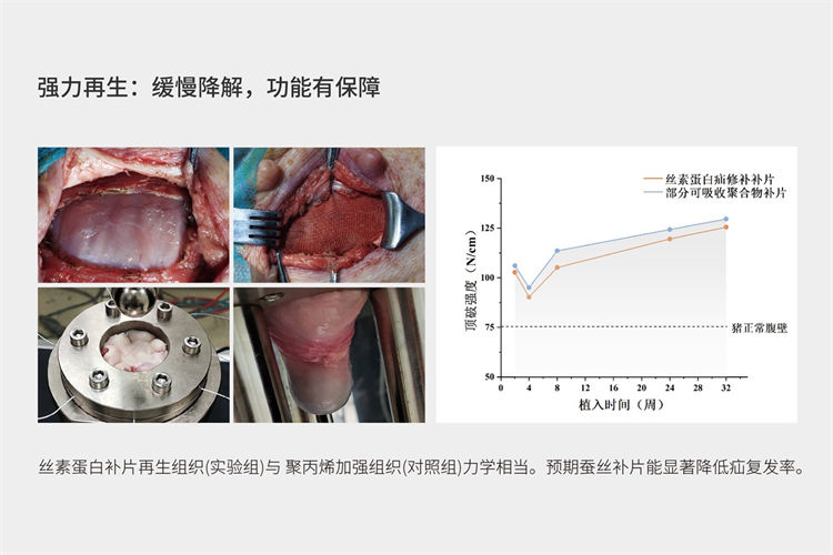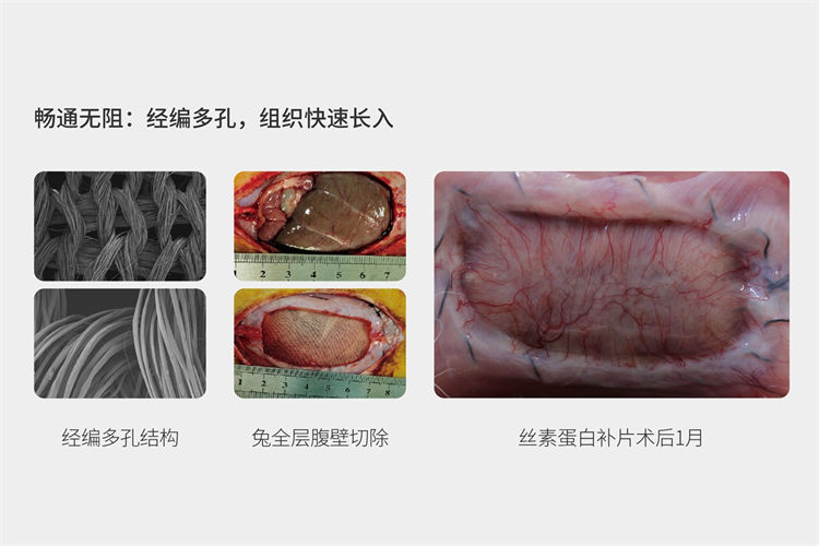 工作机理:该产品植入腹壁软组织薄弱或缺损处,在植入初期提供力学支撑,随着组织再生修复的进行,该材料缓慢降解,最终通过机体再生的组织实现修复。